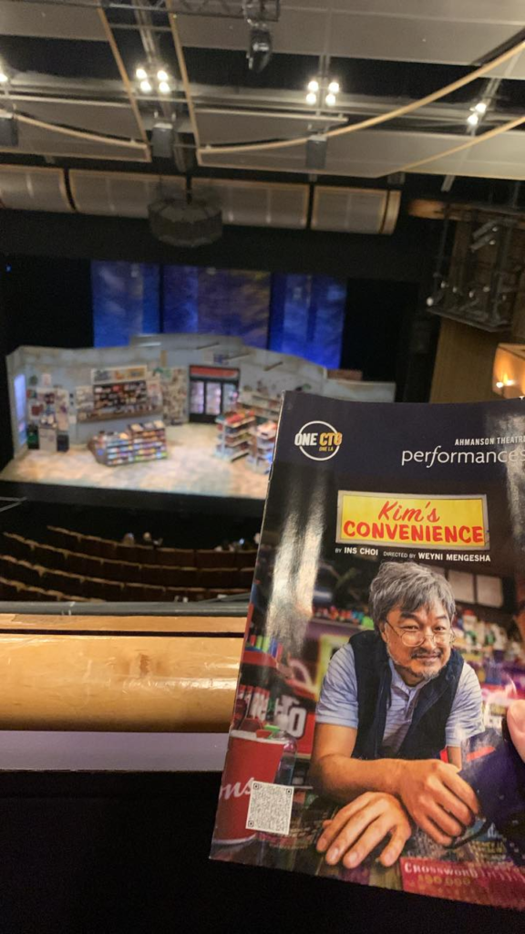 Even though I’m more of a musicals person than a plays person, since I had watched the entire series on Netflix, when I saw this was coming to the Ahmanson I knew I wanted to see it. TodayTix offered me tickets for under $25 to sweeten the deal. I got an email a few days before telling me to plan to arrive an hour early to give me time to park. That is usually an indication that something is happening in all 3 venues of the Music Center, and likely Disney Concert Hall as well. I looked and found there was something at the Mark Taper, but the opera had closed, so I thought maybe I was safe. Still got there plenty early just in case. When I paid the $10 parking fee, the attendant asked me if I was “here for the show” and then asked which show. I told him Kim’s Convenience and then asked what was going on in the other theaters. It turned out that in addition to Here Lies Love at the Mark Taper, the Alvin Ailey dance troup was at the Dorothy Chandler. As early as I got there, I was very nearly directed through the tunnel at the end of the parking lot that leads across the street to Grand Park. Yikes! And I was still so early that the house wasn’t yet open when I arrived! I used the restroom and waited in the lobby for them to open the house.